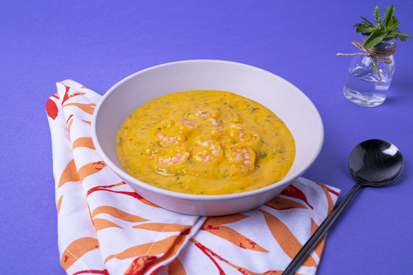 camarão, leite de coco, mandioca, tomate orgânico, pimentão amarelo orgânico, cebola orgânica, azeite de dendê, pimenta biquinho, sal, salsinha orgânica, limão tahiti orgânico, alho, coentro, gengibre em pó.