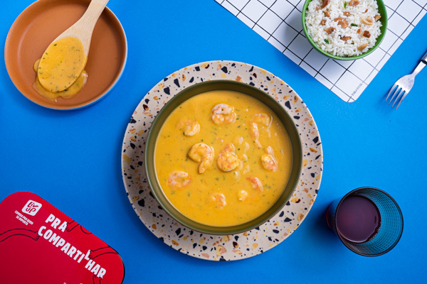 camarão, leite de coco, cebola orgânica, tomate orgânico, batata inglesa, sal, limão tahiti orgânico, azeite de dendê, salsinha, gengibre orgânico, alho, capim limão, curry em pó, pimenta caiena.