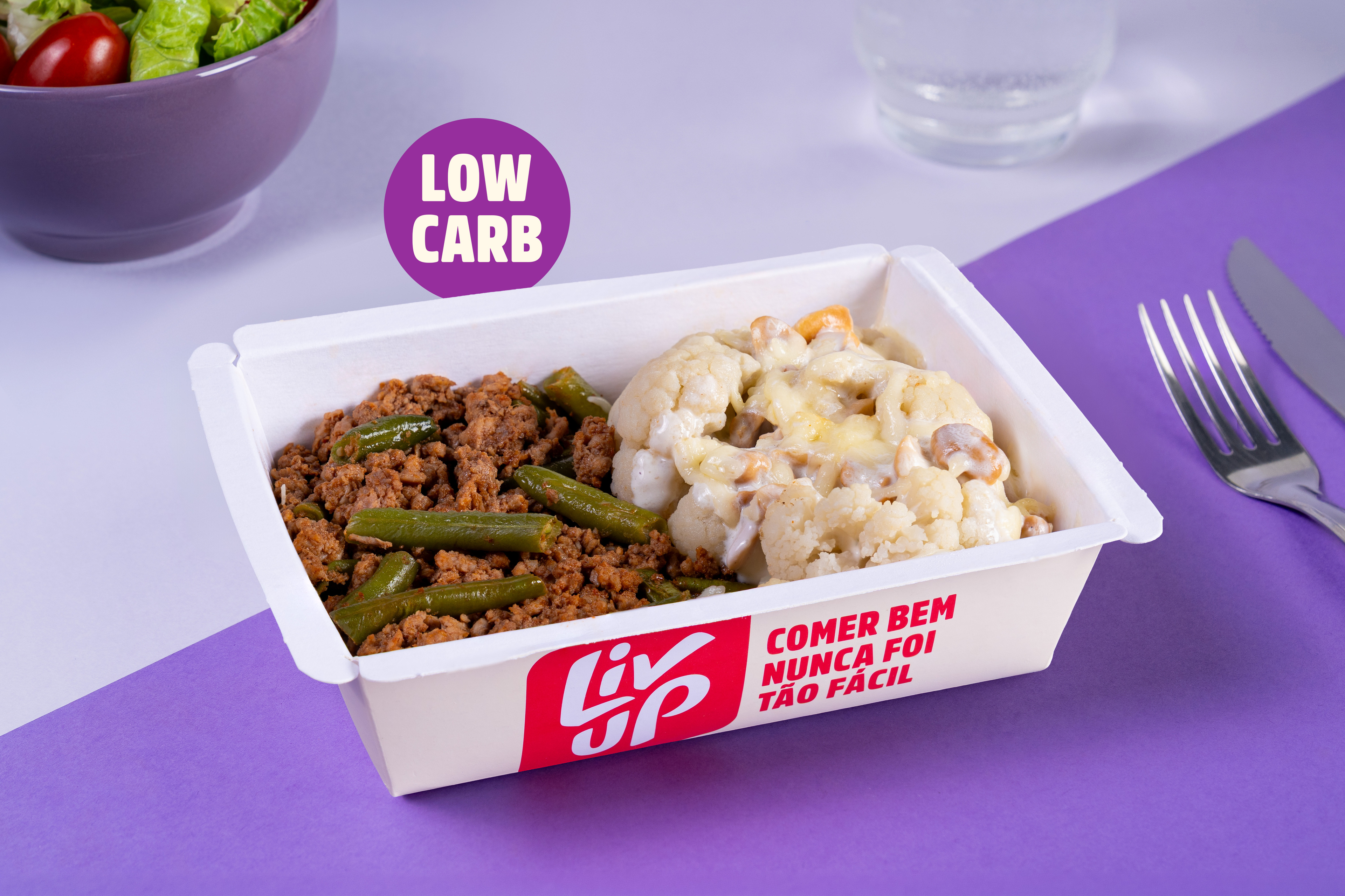 Uma opção leve, com baixo teor de carboidratos: nossa carne moída com vagem bem temperadinha, acompanhada de couve-flor com queijo e finalizada com castanha de caju.
