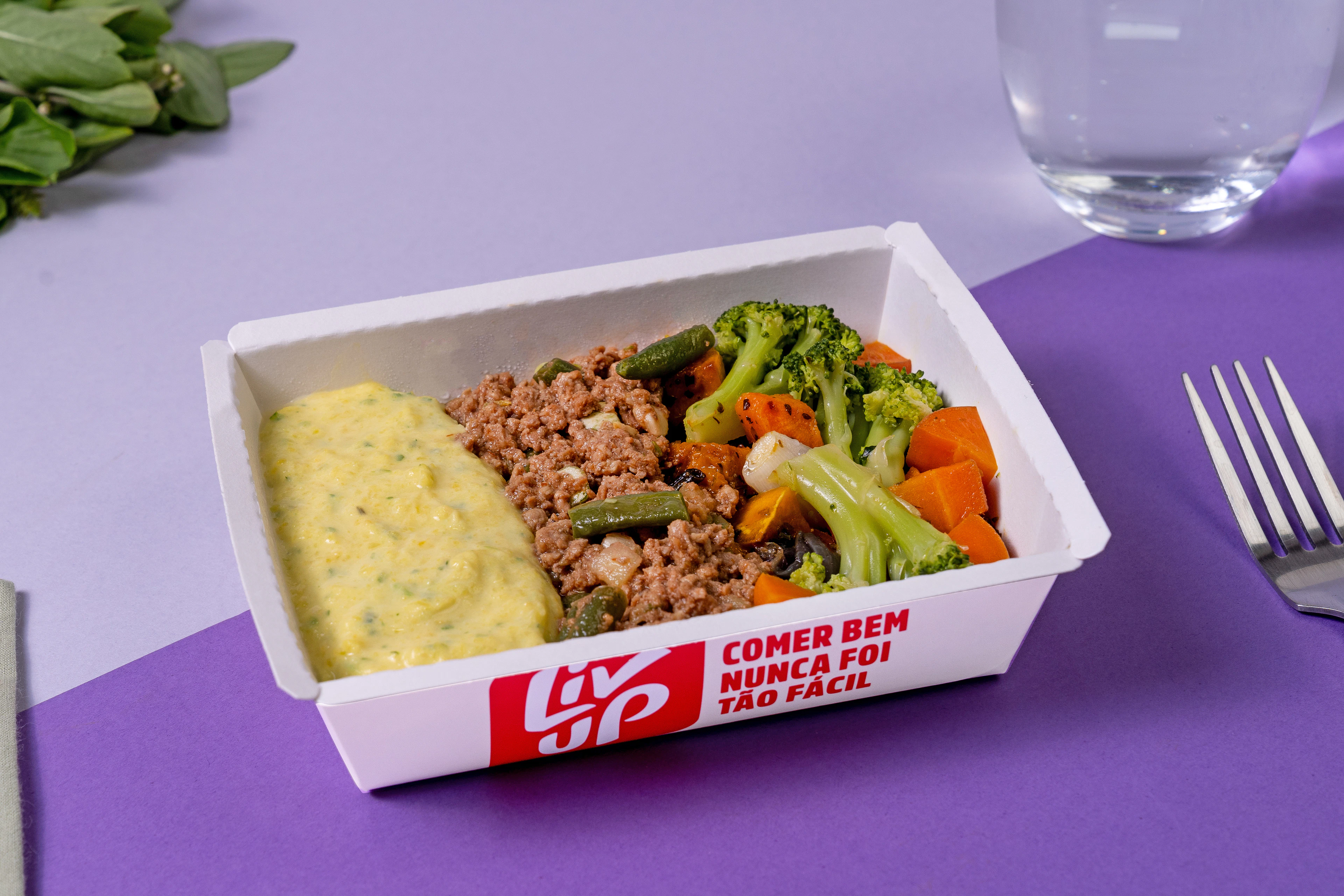 A nossa carne moída bem molhadinha e saborosa com vagem, acompanhada de purê de mandioquinha, juntamente com abóbora, cebola e cenoura assadas. Uma combinação cheia de sabor, pra variar as suas refeições do dia a dia. Carne moída com vagem: 120g | Purê de mandioquinha: 80g | Legumes: 100g