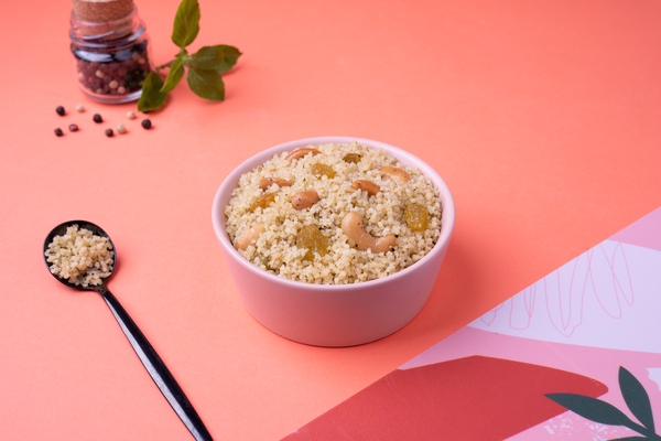 O couscous no Marrocos é servido em dias de festa. De fato, o prato é uma delícia para servir e agradar a todos, mas pode também trazer um sabor diferente para a comida do dia a dia. Feito com a sêmola de trigo, é um tipo de carboidrato que substitui o arroz ou a batata no prato. Usamos uva passa branca, que é mais suave, castanha de caju, cebola roxa e hortelã para criar um tempero único, super especial e saudável.