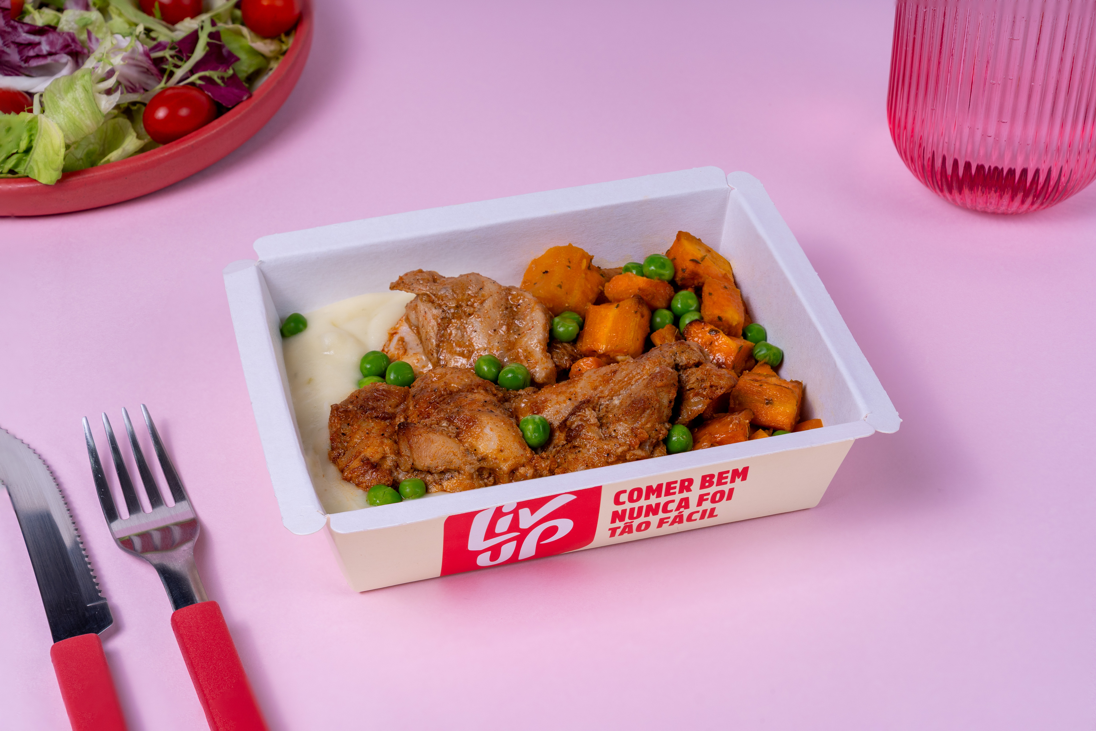 Sobrecoxa com ervilha, purê de batata e cenoura: