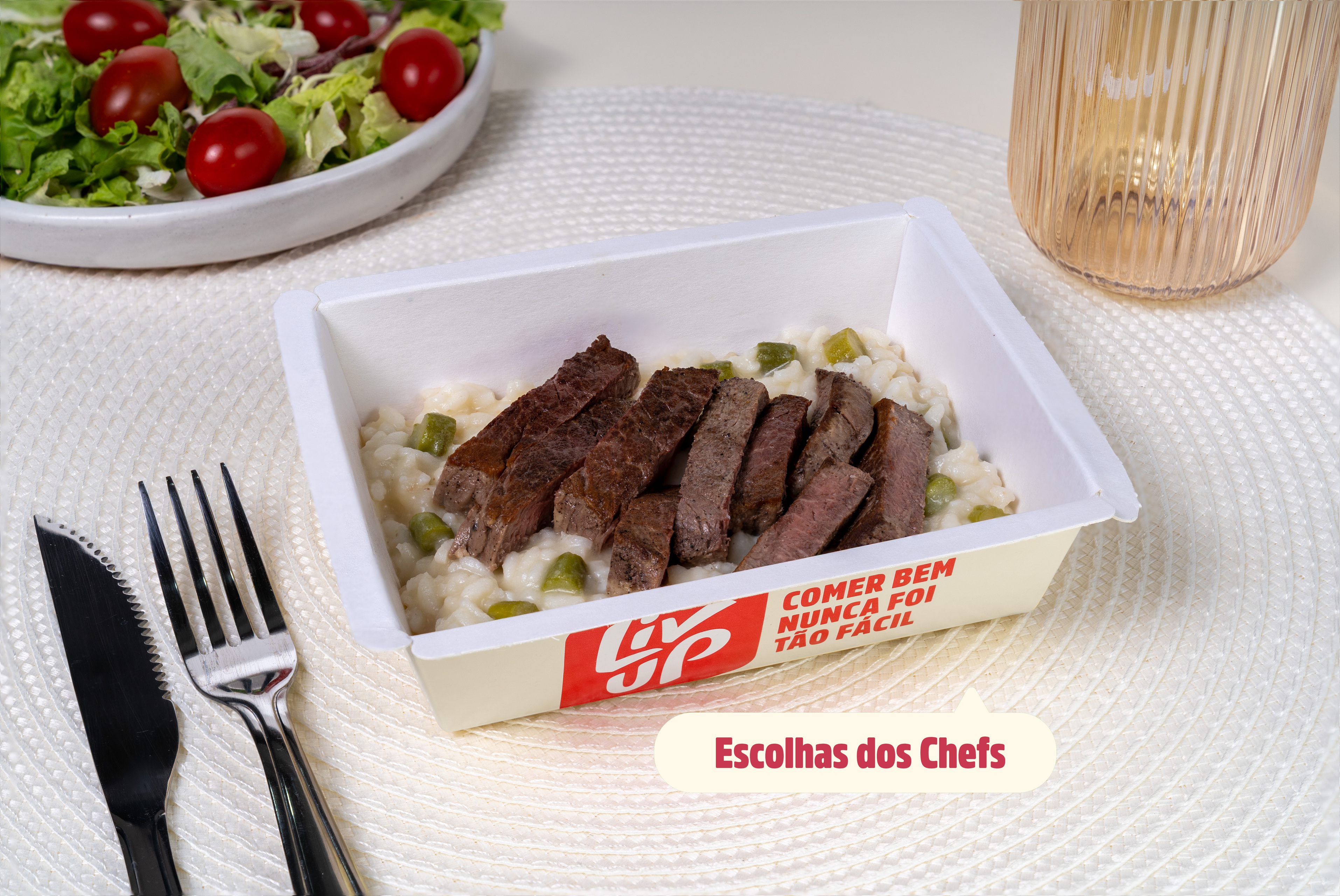Filé fatiado e risoto de aspargos:
