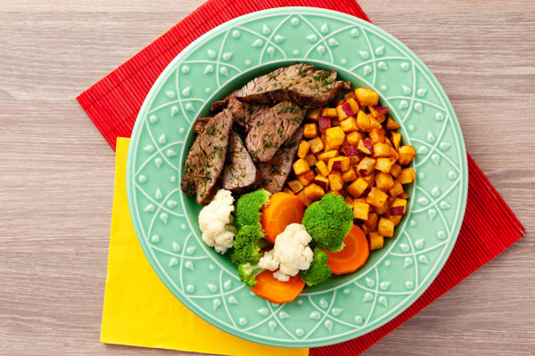 Mais que um prato, esse trio é uma explosão de sabor. O filé mignon, mega macio e suculento, chega na companhia do chimichurri, que tem ervas frescas, vinagre de vinho tinto, um toque de pimenta e páprica. Essa especiaria também condimenta a batata doce, que fica diferente e muito gostosa, e combina com as cores, texturas e nutrientes do mix de legumes. Não dá pra imaginar - melhor provar.