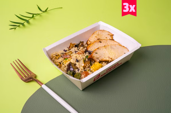 3x Frango assado, couscous e legumes mediterrâneos