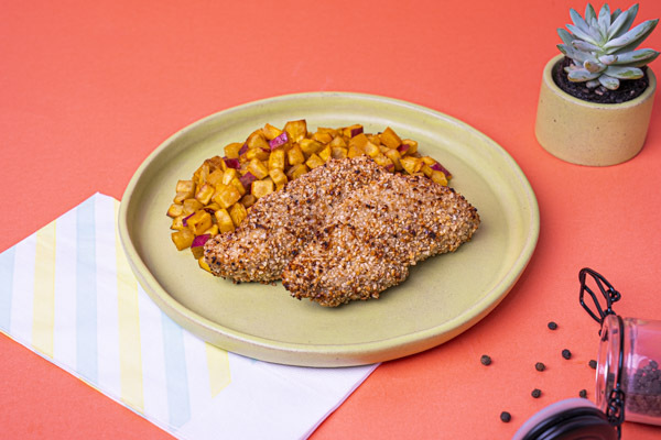 O frango com crosta já virou um clássico e, junto com batata doce temperada com páprica, o sucesso é garantido. Você vai sentir o sabor da páprica sem exageros, o que casa muito bem com o lado delicado do frango. A castanha de caju dá mais brasilidade e sabor pra essa combinação que não tem erro.