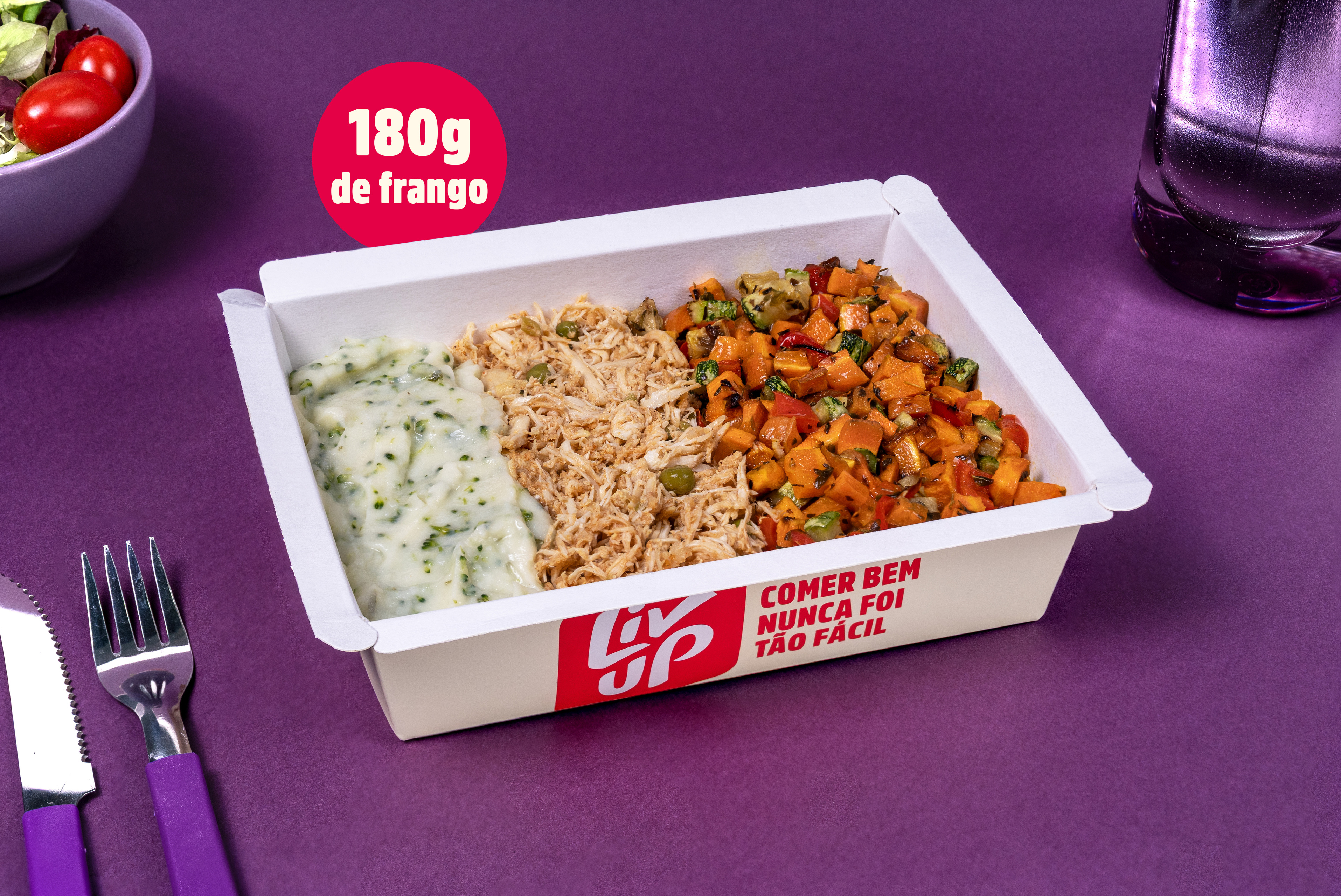 A linha que veio pra te ajudar a alcançar os objetivos, com uma porção maior de 580g, oferecendo mais energia e saciedade! Nessa receita, o frango desfiado com molho e ervilha vem acompanhado de um purê de batata com brócolis bem cremoso, e um mix de legumes no ponto certo. Frango desfiado com molho e ervilha: 180g / Mix de legumes: 200g/ Purê de batata com brócolis: 200g