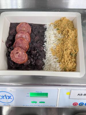 arroz branco, feijão preto, lombo suíno , linguiça tipo calabresa, farinha de mandioca, cebola, bacon, óleo de soja , sal, alho, cebolinha, salsinha, cominho, pimenta do reino, páprica doce, cúrcuma, louro em pó.