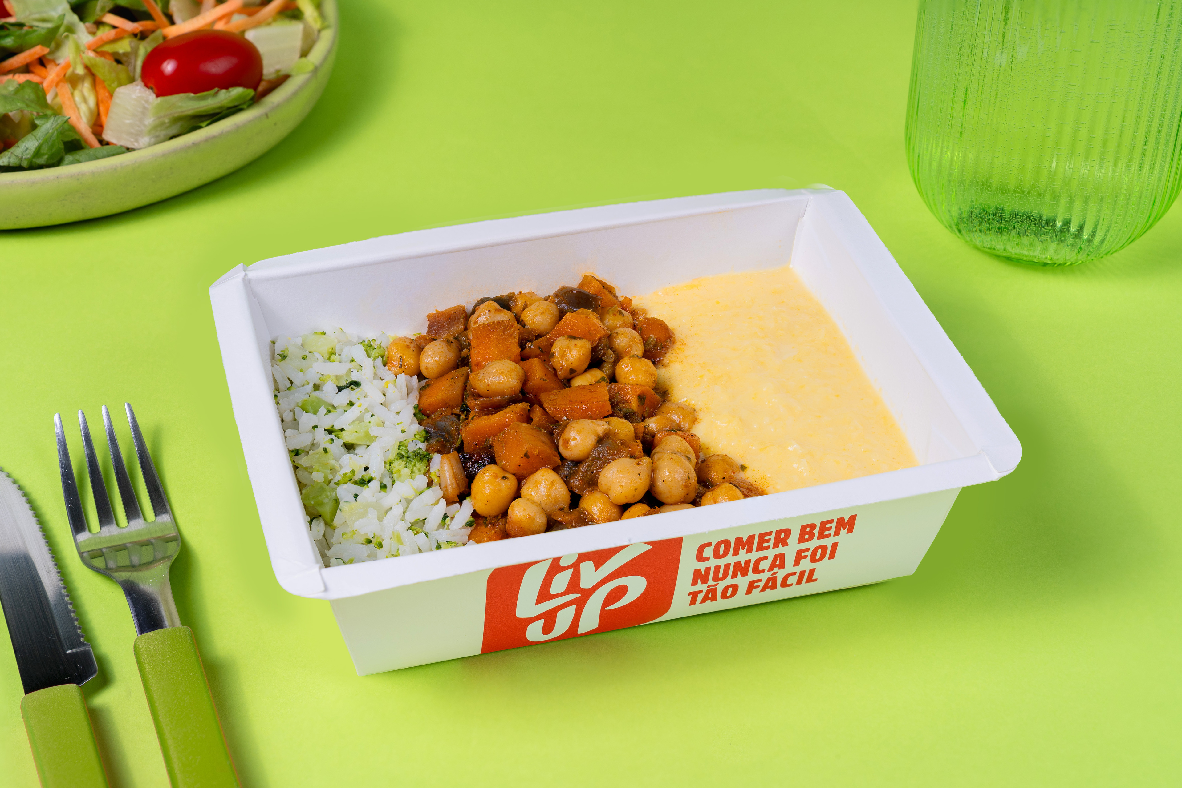 Grão de bico com legumes, arroz e creme de milho: