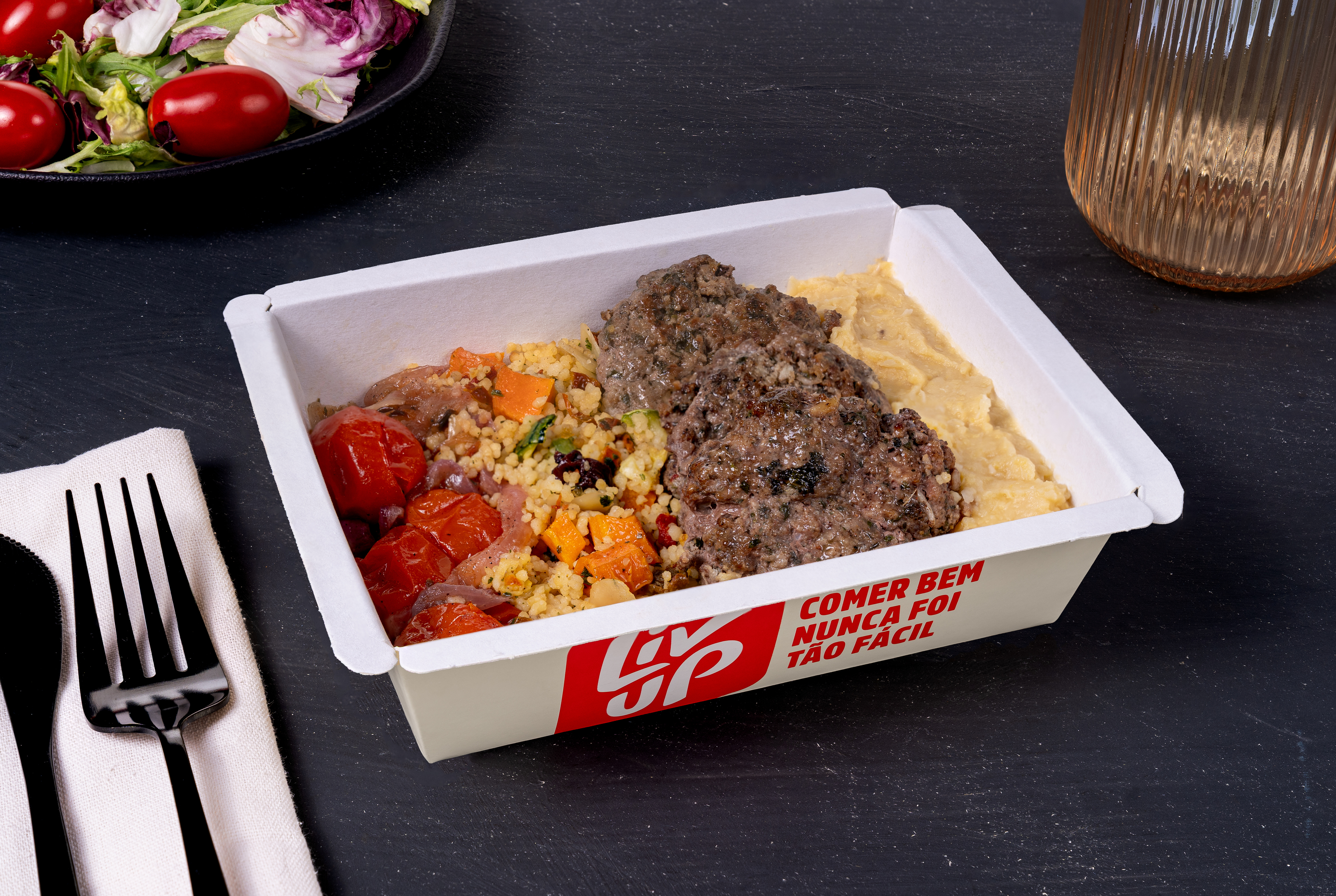 Uma combinação cheia de sabor inspirada no Oriente Médio: nossa kafta suculenta e bem temperada, servida com homus cremoso, couscous leve com legumes e tomates e cebolas assados, que trazem um toque mais adocicado ao prato.
