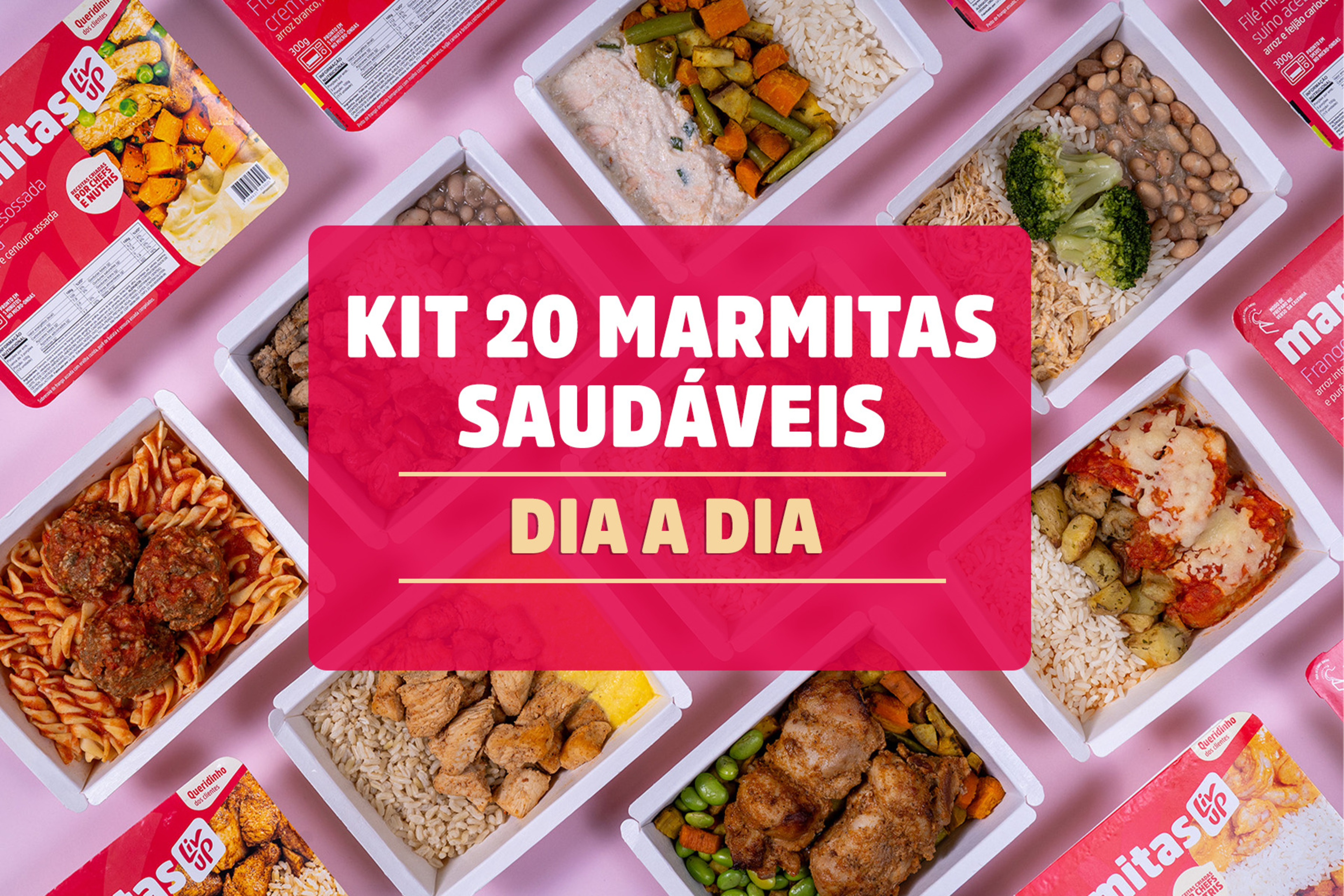 Refeições variadas de 300g feitas com ingredientes naturais, prontas em apenas 5 minutos. Já imaginou ter 20 Marmitas Dia a Dia com muita praticidade, sabor e sem sujar a louça? Aqui, você garante tudo isso! A variedade de itens do kit pode mudar dependendo do estoque da sua cidade, combinado? Aproveite!