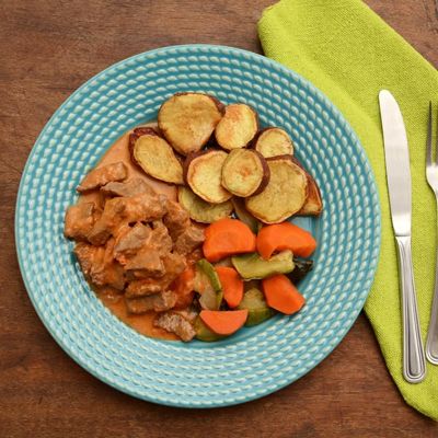 Quem resiste a um estrogonofe de carne com batata? Nesse prato juntamos nosso estrogonofe de carne, que é sem lactose, com a queridinha batata doce. Para dar mais cor e nutrientes acrescentamos o delicioso mix de legumes assados.