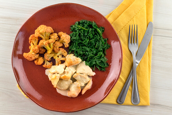 O suculento frango ao molho de queijo brie aparece neste prato com acompanhamentos vegetais mais do que nutritivos e gostosos. Escolhemos o espinafre, que combina muito bem com o molho branco e a couve flor com páprica para um toque de cor e trazer um sabor diferente para incorporar o prato. Uma refeição deliciosa que vai agradar seu paladar, além de fornecer bastante proteína, com baixo teor de carboidrato.
