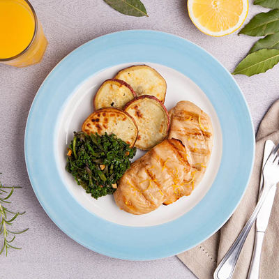 Peito de frango sem antibiótico, limão siciliano, sal rosa e vinagre balsâmico.