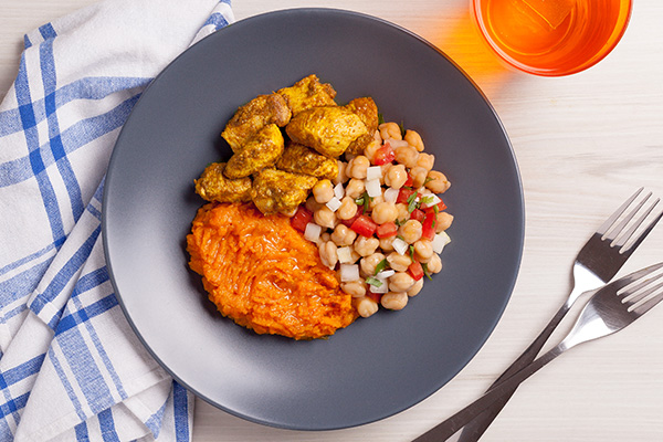 Uma combinação cheia de sabores e saúde. Feito com temperos super poderosos, nosso frango ao molho de curry e cúrcuma - sem antibióticos - aparece acompanhado de um purê bem diferente. É feito apenas com cenoura cozida e amassadinha, com um toque de gengibre - delicioso. É uma explosão de betacaroteno, que dá essa cor mara para o prato. Para complementar, o grão de bico, que substitui o feijão e cai super bem com o frango. Uma refeição para agradar e estimular o paladar!