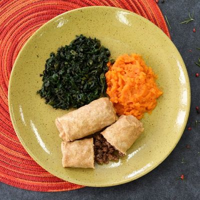 Nossa panqueca é feita com farinha integral, tem massa bem gostosa e fininha. Recheada com carne moída de primeira, combina muito bem com a suavidade do purê de cenoura. Além dessa cor lindona, toda laranja, nosso purê tem um toque picante do gengibre. Fica demais! O espinafre entra para deixar a combinação ainda mais colorida, gostosa e nutritiva. Uma delícia, tudo preparado de forma super caseira, com temperinhos bem naturais e gostosos.