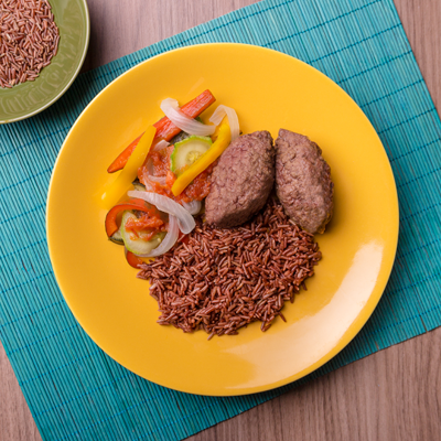 Arroz vermelho, cebola, alho, sal rosa, azeite e louro.