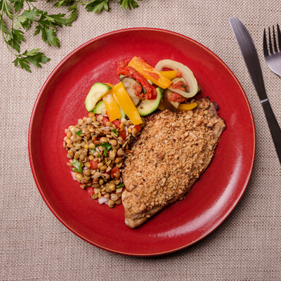 O delicioso sabor da ratatouille e da nossa lentilha combinam super bem com este peixe. O saint peter aqui ganha um versão mega crocante com a crosta de castanhas moídas. O resultado é um prato bem colorido, cheio de nutrientes, e acima de tudo, delicioso!