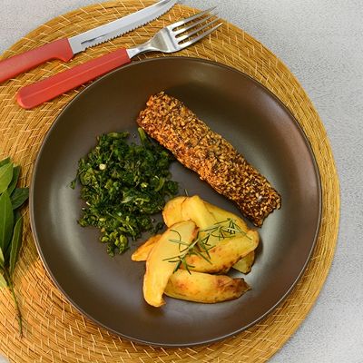 Uma combinação incrível de aromas, sabores, texturas e cores para um prato delicioso e bastante nutritivo. Crocante e repleto de ômega 3, nosso salmão em crosta de sementes de chia e linhaça, aparece muito bem acompanhado! Uma porção de espinafre refogado com temperos naturais forma a dupla perfeita com nossas amadas batatinhas. São assadas com a casca com alecrim, ervinha que parece que foi feita para a batata, quase almas gêmeas!