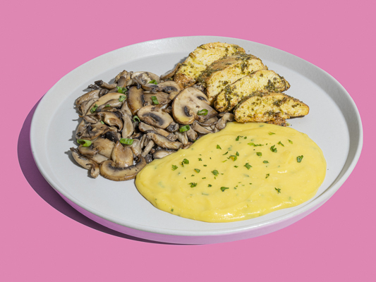 Um peito de frango que leva limão siciliano e hortelã orgânica e vem acompanhado de um purê de mandioquinha, além de um mix de cogumelos Paris, shimeji e shitake orgânicos. Delicioso e saudável, combina sabores diferentes, realçados por temperos como páprica picante e vinagre balsâmico orgânico.