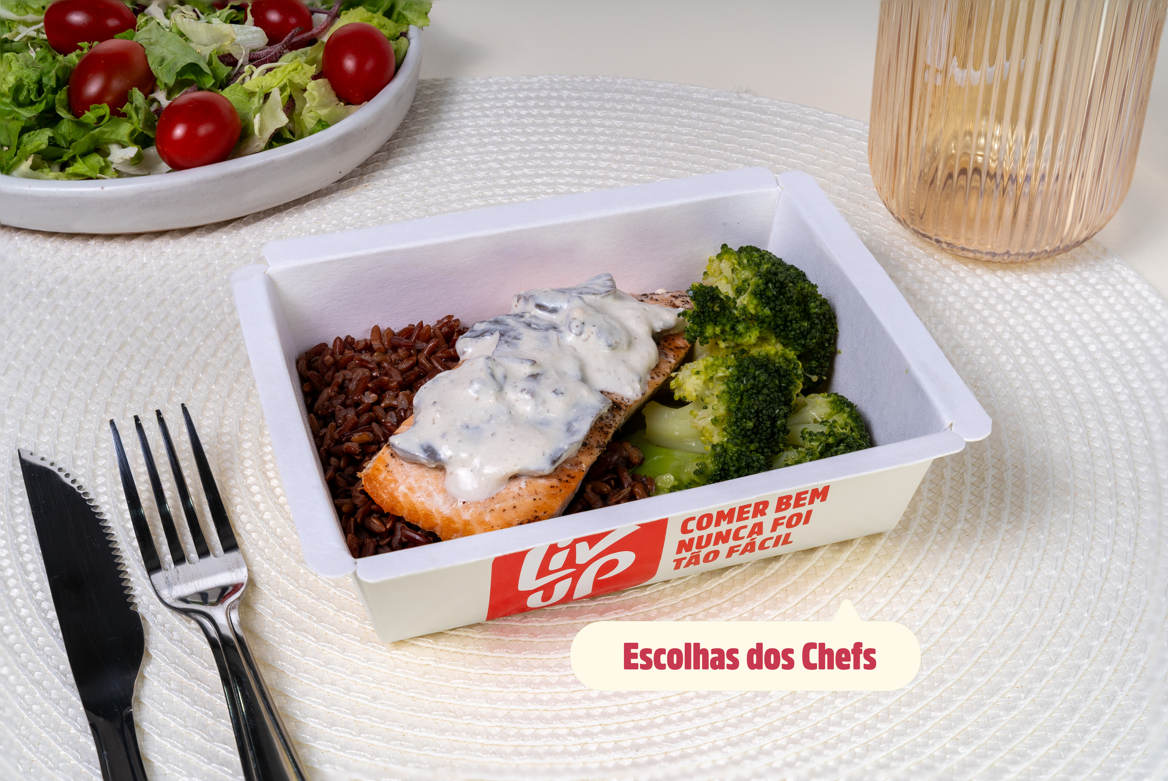 salmão, brócolis, cogumelo paris, arroz vermelho, creme de leite, queijo parmesão, leite em pó integral, goma de tapioca, sal, alho, cebolinha, noz moscada, cebola em pó, louro em pó.