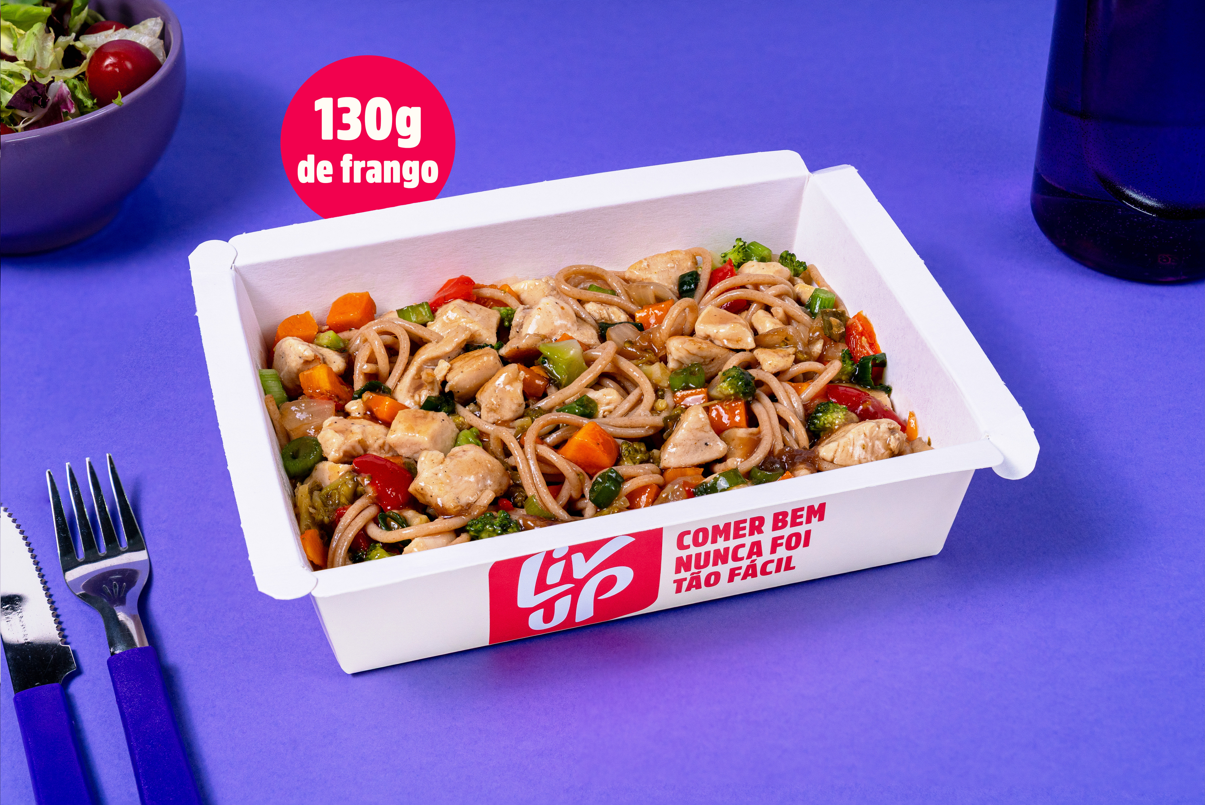 A linha que veio pra te ajudar a alcançar os objetivos, com uma porção maior de 450g, oferecendo mais energia e saciedade! Nossa versão do clássico yakisoba com cubos de frango, legumes, macarrão e os temperos que só os nossos Chefs fazem. Essa receita com certeza vai virar uma das suas queridinhas! Macarrão espaguete integral: 120g / Frango em cubos: 130g / Legumes: 100g / Molho oriental: 100g
